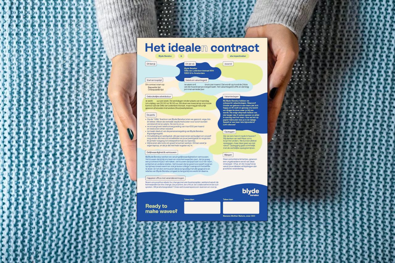 “Van Daniël Maats leerde ik dat er eigenlijk maar vijf dingen in een one-pager hoeven te staan”, vervolgt Kortenoever. “Naam en geboortedatum, rol, startdatum, salaris en of iemand voor bepaalde of onbepaalde tijd in dienst treedt. De rest is vastgelegd in de wet.” Verder staat in het contract onder meer vanuit welke kernwaarden Blyde Benelux werkt en welke voordelen een dienstverband medewerkers oplevert. “Het is echt een contract op basis van vertrouwen. In het arbeidsrecht zie je vaak dat er achter elke mogelijke situatie een artikel staat. Dat is precies wat wij wilden loslaten. We willen niet alles dichttimmeren, omdat er mogelijk iets kan gebeuren. Mocht er toch een probleem zijn, gaan we daar gewoon over in gesprek.”