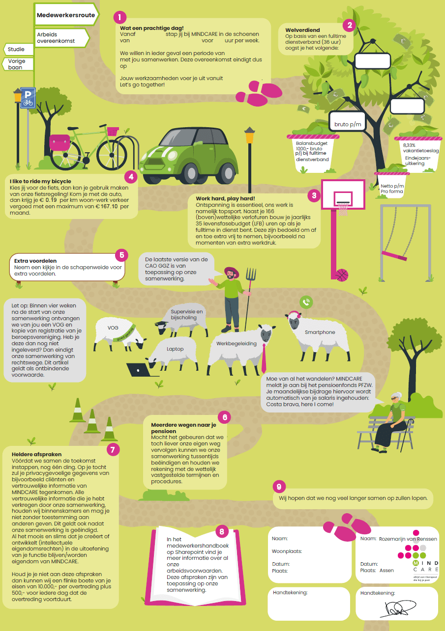 De vormgeving is gedaan door een extern bedrijf, in de huisstijl van MINDCARE. Nieuwe collega’s worden via een medewerkersroute door het contract geloodst. Onderweg komen ze onder meer een geldboom, speeltuin en schaapsweide tegen. “Dat laatste is een knipoog naar ons herder/schaap-systeem.” De onboarding e-learning is door hetzelfde bedrijf opgemaakt, waardoor de twee documenten volgens Van Renssen mooi op elkaar aansluiten.